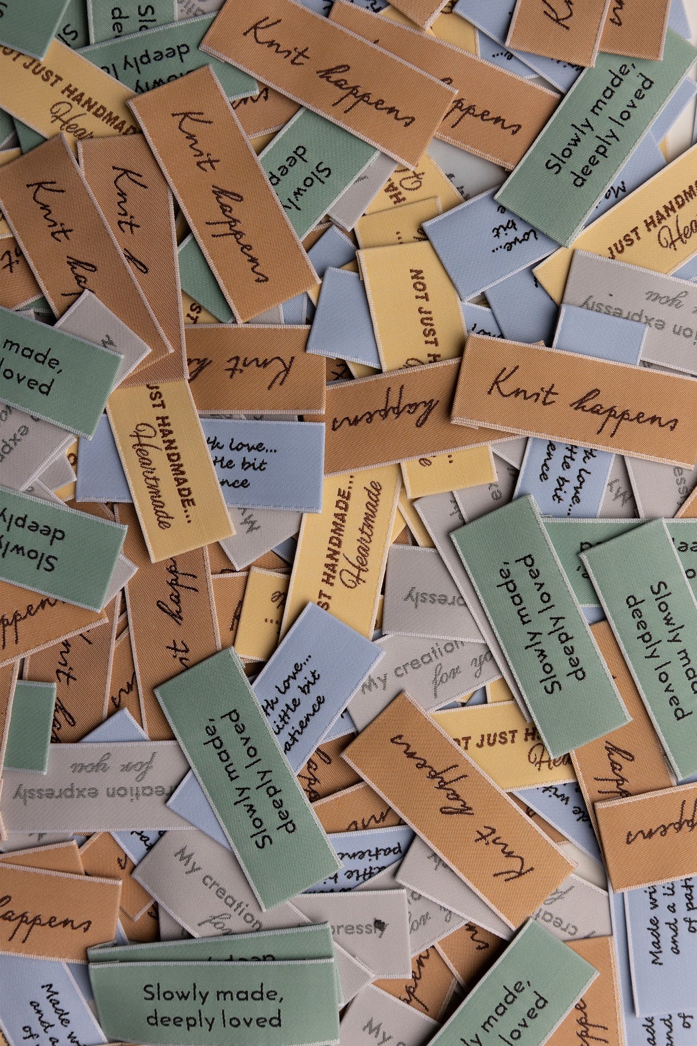 Set of 5 Itaca Yarns woven labels, each with a different design and inspiring message. From playful irony to heartfelt dedication, this colorful collection is perfect to enrich your handmade garments with personality and style. A versatile set that allows you to choose the right label for every project.